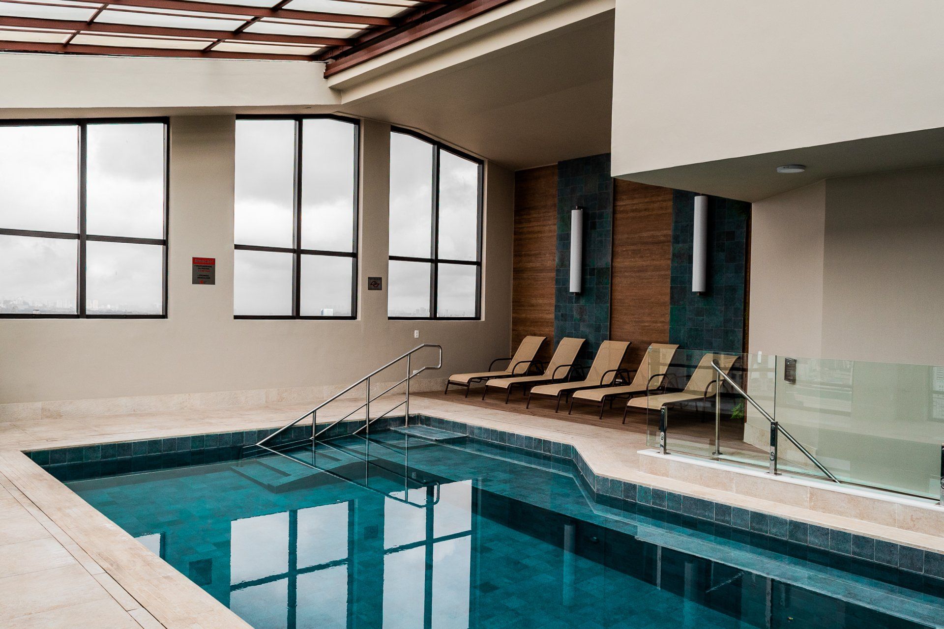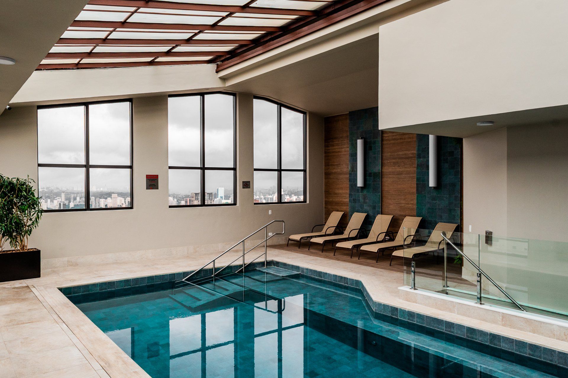 Aproveite o tempo livre desfrutando da paisagem e relaxando em nossa piscina climatizada com teto retrátil ou em nossa sauna das 7 as 22 hs, no 27º andar.